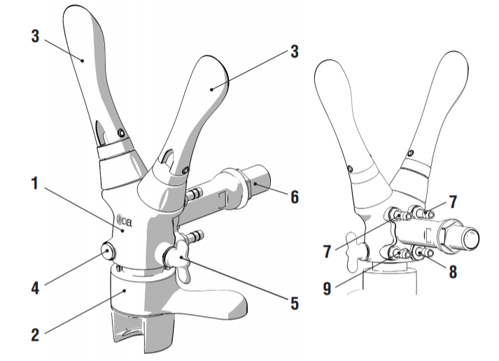 1 - корпус, 2 - ложка, 3 - ручка подачи напитка, 4 - кнопка подачи со2, 5 - ручка дросселя, 6 - штуцер 5/8’’, 7 - ниппель подвода напитка, 8 - ниппель подвода со2, 9 - ниппель дренажа