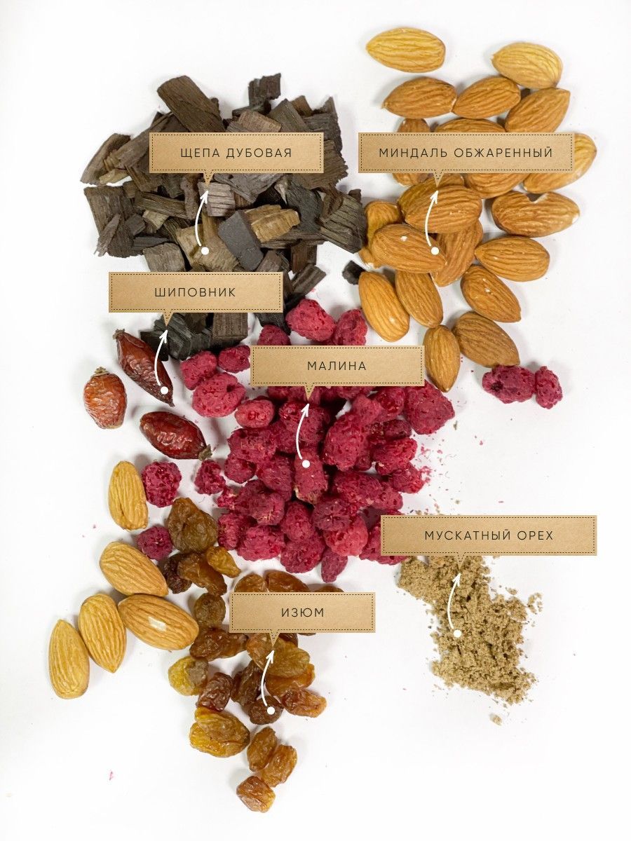 Состав: щепа дубовая, малина, миндаль обжаренный, мускатный орех, изюм, шиповник, декстроза.